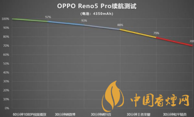 根據測試結果顯示,使用OPPO Reno5 Pro觀看60分鐘1080P視頻僅耗電3%、刷30分鐘微博僅耗電4%、刷30分鐘抖音僅耗電5%、玩30分鐘《王者榮耀》僅耗電9%、玩30分鐘《和平精英》僅耗電9%,在高強度使用3小時后,OPPO Reno5 Pro共計耗電30%,剩余電量還有70%。