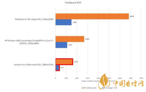 Maxon 的 Cinebench 的結果顯示 M1 也占據了絕對的領先優勢,單核和多核成績分別為 1496 分和 6838 分,輕松擊敗 Surface Pro X 的 371 分和 1604 分。