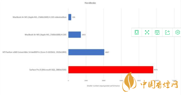 再來看看開源視頻轉碼工具 Handbrake,MacBook Air 完成將一段 12 分鐘的 4K 視頻轉碼成 1080p H.265 文件的速度是 Surface 的 6 倍。