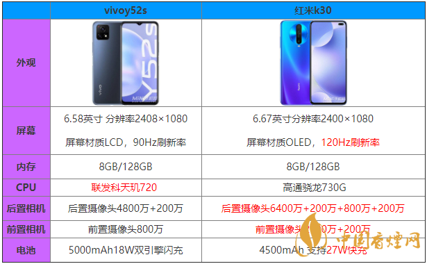 小結:在屏幕方面,OLED材質在亮度、對比度,可視角度等方面優于LCD材質屏幕,所以,不論是從屏幕材質還是所支持的屏幕刷新率來說,紅米k30優于vivoy52S