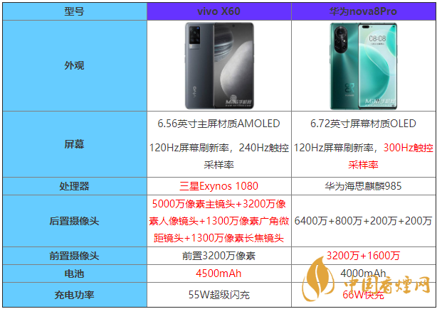 近期迎來vivoX60的發布,吸引大家目光的同時,華為nova8Pro也格外引人注目,vivoX60和華為nova8Pro那個好,下面香煙網小編將對vivoX60和華為nova8Pro參數對比進行介紹,感興趣的朋友一起來看看吧!