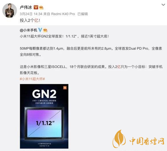 前幾天小米11超大杯預(yù)熱的海報(bào)里,直接叫板挑戰(zhàn)專業(yè)影像!據(jù)官方解釋,這顆鏡頭是小米影像和三星用時(shí)18個(gè)月聯(lián)合研發(fā)的成果,盧偉冰也直接發(fā)博坦言道,小米為這個(gè)元器件投入了兩個(gè)億!小米去年首發(fā)一億像素,今年首發(fā)GN2,都投入了大量資金,從這上面就能看到,小米這兩年為了突破相機(jī)的天花板而做出的努力!