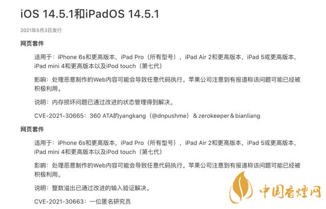ios14.5.1怎么樣,時隔一周之后,蘋果今天(5月4日)發布了 iOS 14.5.1 正式版系統,同時發布的還有 iPadOS、macOS、watchOS 等新系統更新。本次更新日志如下,主要是關于安全性的更新,建議所有用戶安裝。下面就是香煙網小編為大家整理的有關ios14.5.1的詳情介紹。