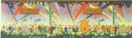 最為獨(dú)特的團(tuán)結(jié)主題煙標(biāo)莫過于貴陽煙草公司出品的“祖國”煙標(biāo)。這枚出品于上世紀(jì)50年代的煙標(biāo),以橫長的寬幅全景畫面,描繪了在彩色射燈的襯托下,我國各族人民歡聚于華表周圍盡情舞蹈的宏大場面。