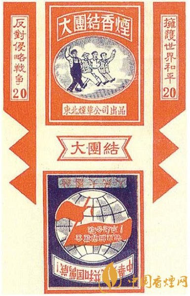 東北煙草公司出品的“大團(tuán)結(jié)”煙標(biāo),主版圖案為4個(gè)男性人物攜手并進(jìn)的場景,側(cè)標(biāo)位置分別印有“擁護(hù)世界和平”“反對侵略戰(zhàn)爭”字樣,副版圖案為地球上飄揚(yáng)著一面上書“全世界無產(chǎn)者聯(lián)合起來”字樣的旗幟,在其上下則分別印有“中華人民共和國萬歲”“人民大團(tuán)結(jié)”字樣。