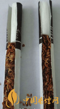 煙支降焦工藝差異比對:真品煙支采用34mm長度的聯合效益通風槽濾嘴,有效降低焦油和一氧化碳量,又充分保留香氣;假煙煙支采用普通單一濾嘴棒,其濾嘴棒長度較短,無法達降低焦油和一氧化碳量理化數值效果。