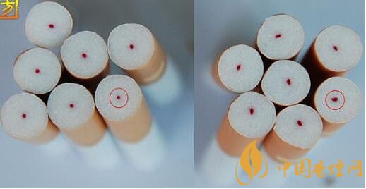 如圖五、圖六紅框標注所示,真煙的HCF過濾纖維(俗稱紅線)位于嘴棒中央,側面呈規則圓形,假煙則形狀各異參差不齊。有些假煙,中間的紅點是印刷上去的。