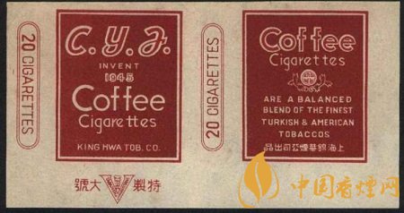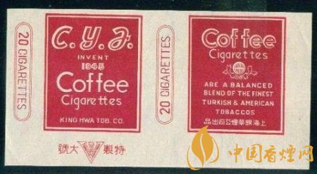 這張煙標在白底色上做文章,正標上是深赭色長方框,正標兩旁印有兩個紅雙線兩端弧形的長方框,內寫有紅色“20 CIGARETTES”,即為20支一包的卷煙規格。副標印有咖啡的英文單詞,其下一個向上半開的花邊圓弧框內有個白色圓圈,圈內是豎寫的中文字“咖啡”,字體很小,不仔細看難免忽略。副標下半部分則有一段全英文產品介紹“ARE A BALANCED BLEND THE FINEST TURKISH & AMERICAN TOBACCO”,譯為“該產品平和摻入了一流的土耳其和美國煙草。”底部為中文字“錦華煙廠出品”。“Coffee Cigarettes”英文字占據了整張煙標的大部分空間,絕對奪人眼眸。