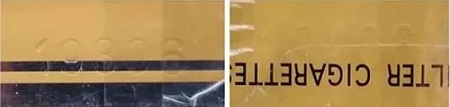 真品卷煙商標印刷采用“凹印”,兩種顏色交界邊緣呈現虛邊或鋸齒狀。假冒卷煙商標印刷一般采用“膠印”,兩種顏色交界邊緣比較清晰、光滑,無鋸齒狀。(左真右假)