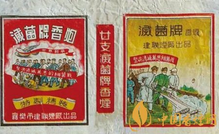 上個世紀50年代,襄樊市建聯煙廠出品一枚“滅菌牌”煙標(圖1)。這枚煙標主版描繪了我國各界民眾聚集于一起,手持書有“堅決消滅萬惡的細菌戰”紅底白字橫幅,在路上行進的圖案。在人群的上空則飛翔著一只口銜“世界和平”紅底白字橫幅的和平鴿。副版突出表現了三名戴著口罩的民眾消滅病毒的形象,其中兩個人拿著噴霧器,一個人拿著掃帚,正在對地面噴霧消毒。緊跟在他們后面的,是各界民眾高舉“堅決消滅萬惡細菌戰”等紅底白字橫幅的人群。