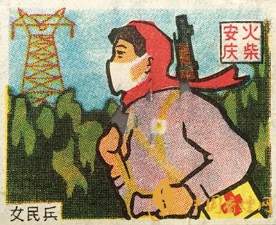 除了戴口罩的醫務人員形象外,火花上戴口罩的人物形象還有不少,如裹著冬裝的少年兒童、肩背藥箱的女民兵(圖3)、扛著掃帚的環衛工人、在田間噴灑農藥的科技人員、在食堂為餐具消毒的服務員等。南京火柴廠出品的“講衛生”系列火花中,還替“惠山泥人”戴上了口罩(圖4)。