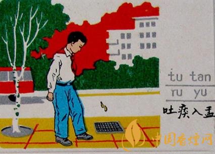 火花圖案采用宣傳畫的形式,人物形象生動逼真,色彩鮮艷明快,具有濃郁的生活氣息。如一枚主題為“吐痰入盂”的火花(圖2)上,一位穿白襯衫系紅領(lǐng)巾的小男孩正彎著腰,對準(zhǔn)人行道的一口窨井吐入一口痰。背標(biāo)除一枚“精神文明”紅色橢圓篆印外,另有“小小一口痰,細(xì)菌千千萬”的宣傳文字;還有一枚主題為“講衛(wèi)生”的火花上,一個揮舞著小紅旗的大爺,在綠樹成陰、高樓林立的繁華鬧市,正對一年輕家庭亂扔垃圾的行為進(jìn)行勸說教育,旁邊佩戴紅袖章的大媽打掃著他們隨手丟棄的雜物,小女孩則在一旁低頭認(rèn)錯。副標(biāo)上“違章必罰”的紅色篆印十分醒目。通過小小的火柴,科學(xué)宣傳防疫知識,提高公眾自我保護(hù)意識,早宣傳,早預(yù)防,起到了事半功倍的作用。