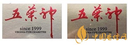 真品卷煙:“五葉神”字體筆畫流暢自然,套印準確,筆畫基本無凸起,字體筆畫顏色為鮮紅。