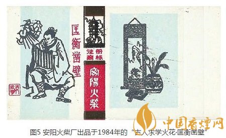 上世紀80年代,安陽火柴廠出品的“古人求學”火花,再現了部分古代學霸身處逆境、好學不倦的形象。這套火花主版為我國傳統文化中的文書工具,即“文房四寶”毛筆、硯臺、墨、紙,其中紙已經畫成了一幅精美的山水國畫,裝裱后掛在墻上,以供觀賞。主版則分別描繪了車胤束螢、黃霸讀經、劉恕忘食、孫敬懸梁、荀淑求教、買臣負薪、鄭王辭位苦讀等古代十二位著名的讀書典范代表。其中“匡衡鑿壁”(圖5)一枚,描繪了西漢匡衡鑿穿墻壁引鄰舍之燭光,手捧竹簡苦讀的形象。