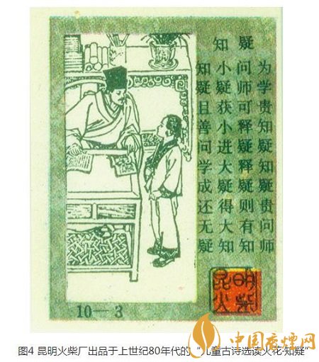 讀書學習貴在求教,一有疑問馬上向老師請教,以此獲得更大的進步。上世紀80年代,昆明火柴廠十枚/套的“兒童古詩選讀”火花中,“知疑”(圖4)就定格于一名學童在向一名私塾先生提出自己的疑問后,傾聽私塾先生給他講解。畫面旁邊還配印有古詩“為學貴知疑,知疑貴問師。小疑獲小進,大疑得大知。知疑且善問,學成還無疑”。