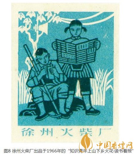 徐州火柴廠出品于同年的四枚/套的“知識青年上山下鄉”火花,“讀書看報”(圖8)一枚再現了一對知青利用休息間隙,在田間地頭讀書看報補充知識的畫面。