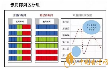 縱向陳列較橫向陳列更符合顧客視線軌跡的運行,能最大限度地提升顧客對排面的關注,避免顧客視線死角的形成。如下圖: