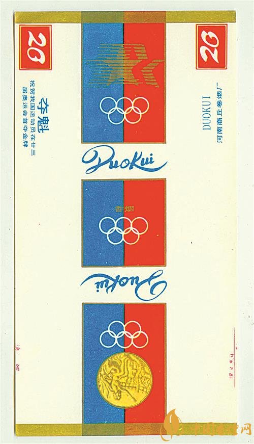 1984年,在美國洛杉磯舉行的第23屆夏季奧運會上,我國射擊運動員許海峰實現了我國奧運金牌零的突破。為祝賀我國運動員取得好成績,上世紀80年代,河南商丘卷煙廠出品了多個版本的“奪魁”煙標。其中一個版本的“奪魁”煙標(圖①),圖案采用紅色、藍色和金色為主要配色,主版圖案為洛杉磯奧運會會徽,左側位置印有“祝賀我國運動員在廿三屆奧運會首奪金牌”字樣,副版上印有奧運會金牌圖案和奧運五環標志。同時期,山東兗州卷煙廠出品了“五洲”煙標,主、副版圖案分別為第23屆夏季奧運會會徽和奧運五環標志。