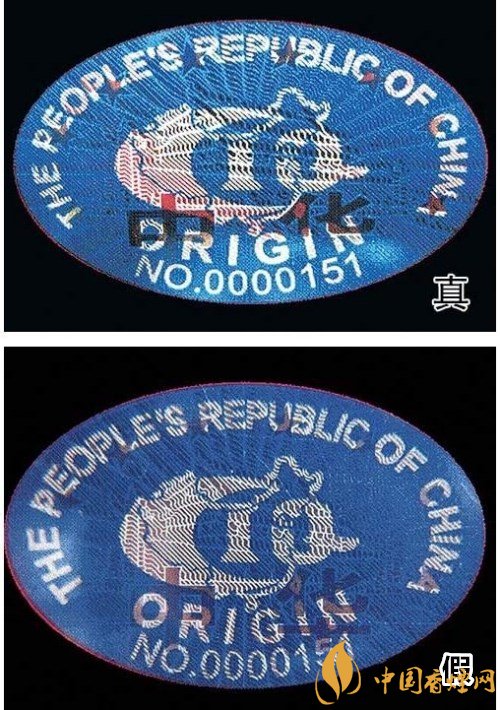 3、“中華”原產地標志為藍色橢圓形,折光可見“中華”字樣、8顆“★”及天安門圖案。真煙色彩飽滿,圖案清晰;假煙色彩暗淡,圖案模糊。