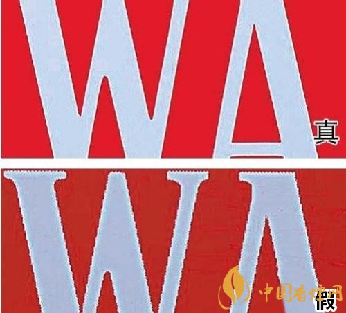 4、真煙白色字體邊緣規整光滑,字跡飽滿;假煙白色字體邊緣粗糙,色彩污濁,有明顯鋸齒印。