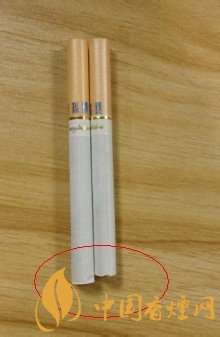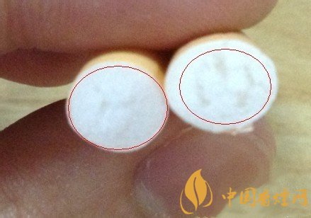 左邊真煙金色圓圈部位與煙嘴結(jié)合比較完美,毫無縫隙,而且色澤靚麗印刷不拖泥帶水,細(xì)看右邊的金色圓圈與煙嘴結(jié)合空隙較大,中間居然脫節(jié)了。而且光圈也比較粗糙。