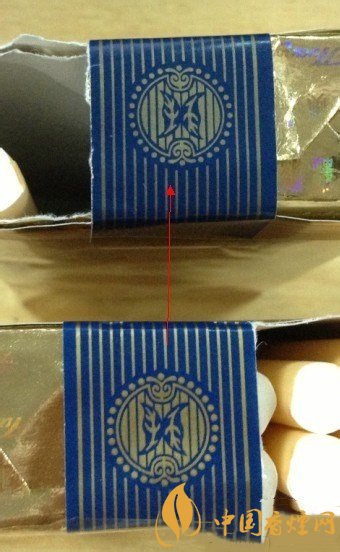 下面的真煙藍色部位顏色光鮮,有色澤,而上面的假煙略顯暗淡。從中間的圓圈部位不難分辨出來。
