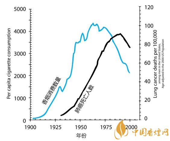 大家一看這個圖,就會發現吸煙數量和肺癌死亡數量的曲線幾乎一模一樣,但有大約25年的滯后:吸煙增加,肺癌會在25年后相應增加,吸煙減少,肺癌也會在25年后相應減少。這個奇特的滯后主要是因為肺癌發生是個非常慢的過程,從癌前變異,到早期癌癥,到晚期癌癥,一般需要10~20年時間。