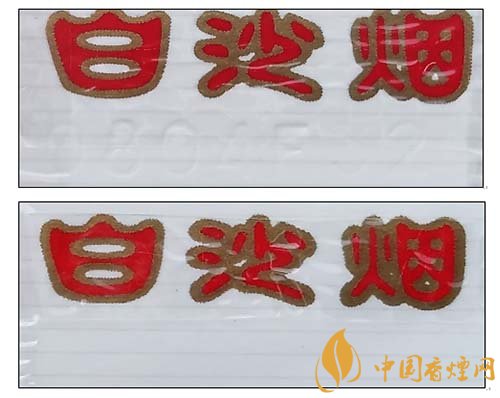 真品卷煙:背面Baisha拼音字母凹印,紅色與白色交界位置呈現模糊不清晰的鋸齒痕跡。