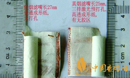 2、煙支過濾嘴不同,真品卷煙濾嘴長25mm,三排激光預打孔,高透成型紙,有無膠區;假煙濾嘴長27mm,普通成型紙,無打孔。