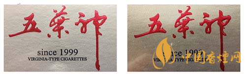 真品卷煙:“五葉神”字體筆畫流暢自然,套印準確,筆畫基本無凸起,字體筆畫顏色為鮮紅。