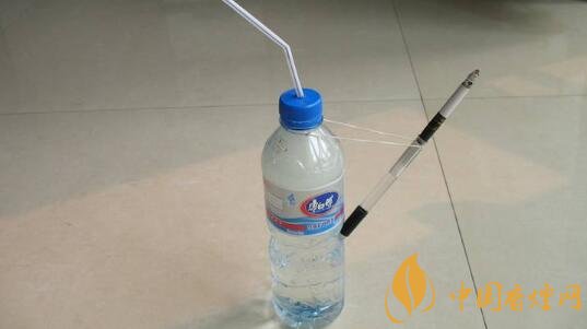 第三步:裝上大半瓶子清水,一個水煙就做好了。用嘴從一側軟管吸氣的時候,瓶子里的空腔氣壓降低,在大氣壓的作用下,空氣從裝有香煙的軟管進入,經過瓶子里清水的過濾,最后被吸進人嘴里,這一步在怎么自己做水煙中最為詳細。